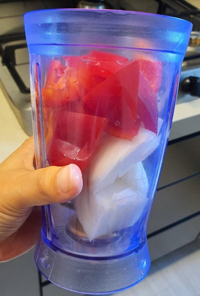 준비물 : 무 반개(500g 정도), 파프리카 1/2개, 양파 1/2개, 대파 약간, 사과즙 반팩, 다진 마늘 1스푼, 멸치액젓 2스푼, 새우젓 1 티스푼, 흰밥 1스푼, 고춧가루 1티스푼, 굵은소금 1티스푼